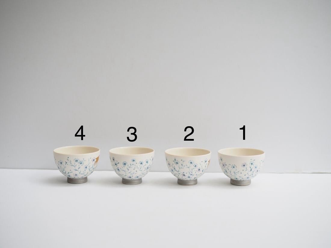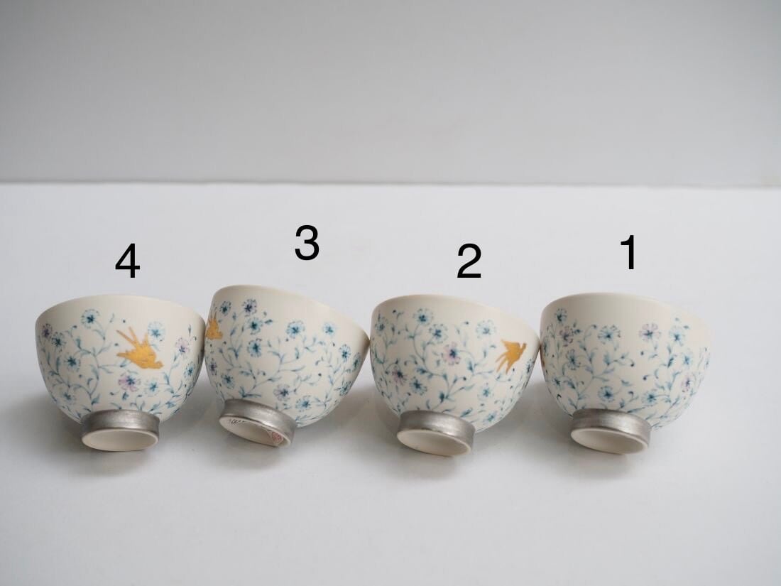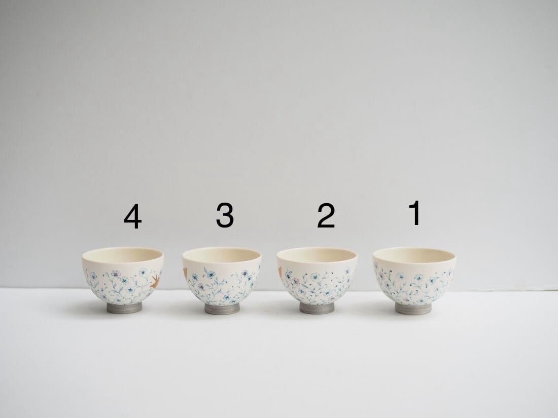 草花の絵は実在する植物と矢田さんご本人がイメージした草花を混ぜてフリーハンドで描かれたものです。そして、この上絵が矢田さんオリジナルの手法で「水彩画風」な女性らしい雰囲気になっています。